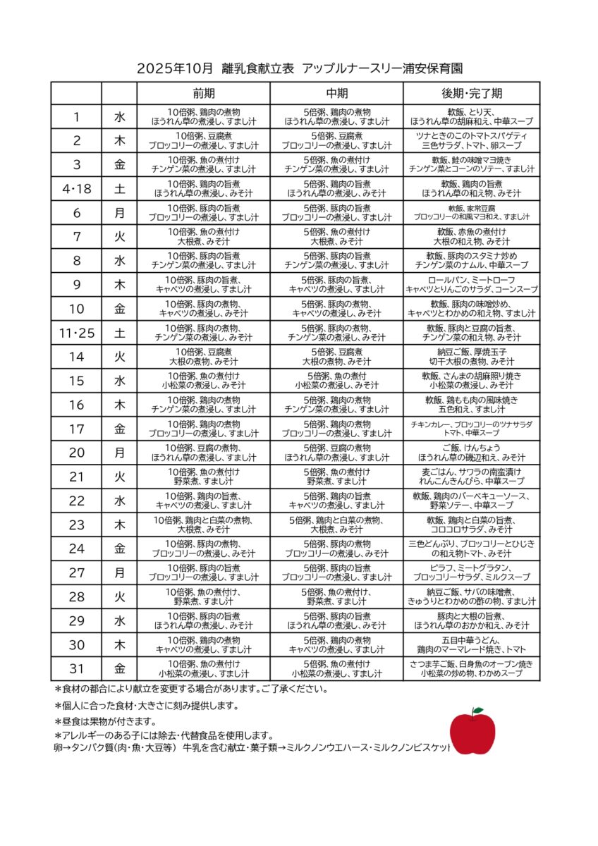 10月献立表(浦安園)