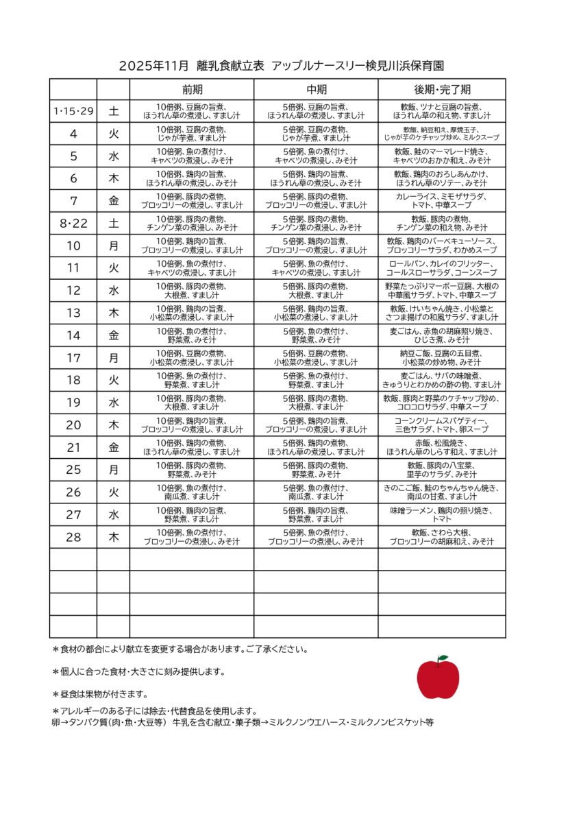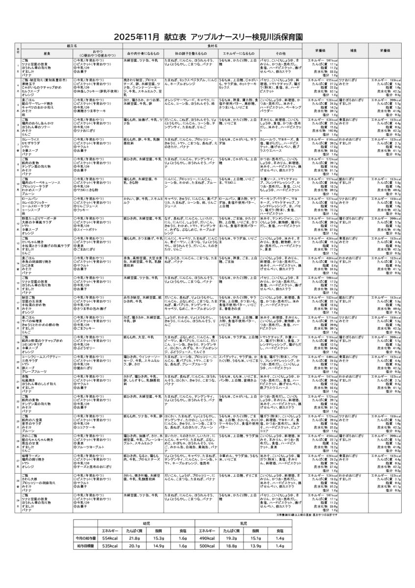 11月献立表(検見川浜園)