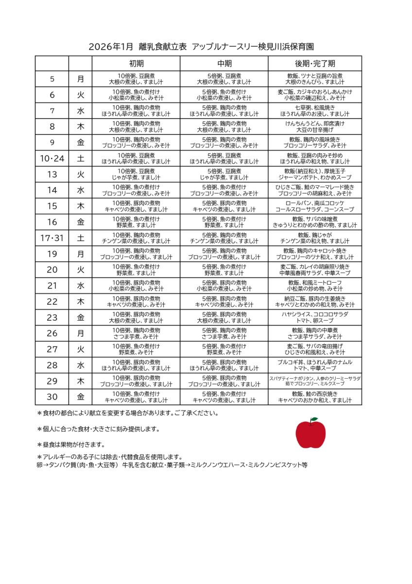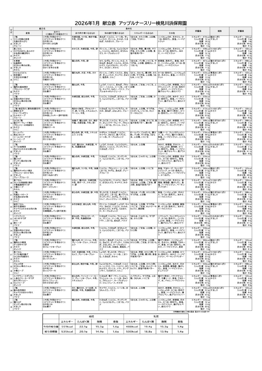 1月献立表(検見川浜園)