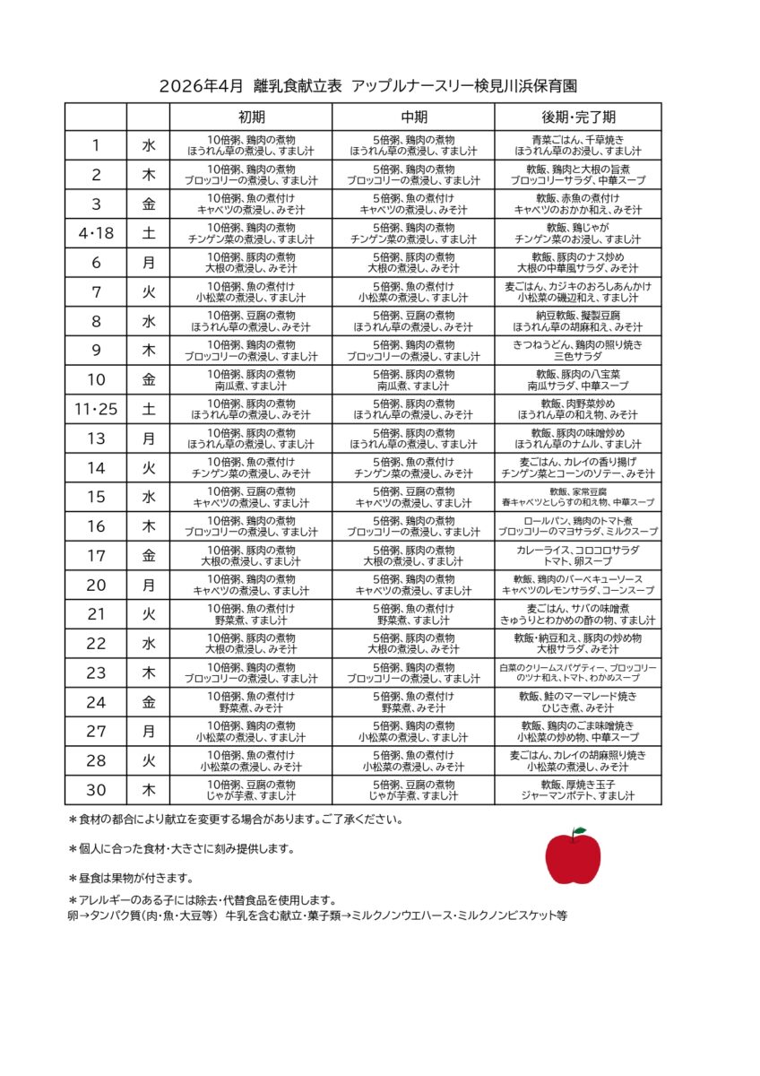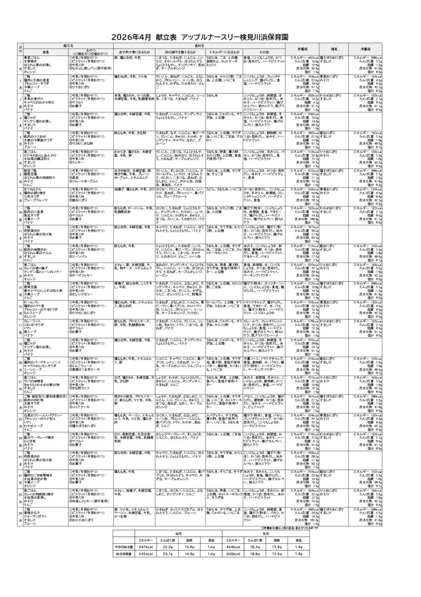4月献立表(検見川浜園)